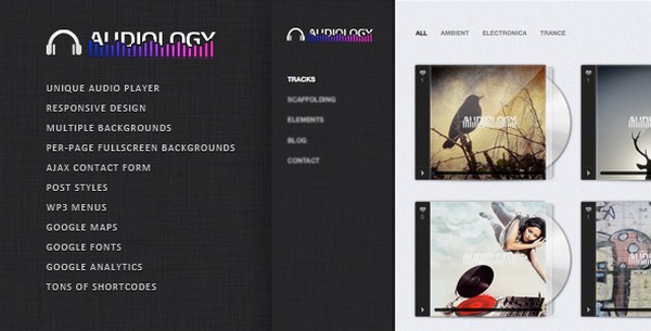 Audiology is a fully responsive and elegant WordPress theme that comes with oodles of perks including per page backgrounds, automatic text links, custom typography options, automatic image sizing, social integration, custom posts formats, related posts via tags, multiple backgrounds, Google Analytics and a Unique MP3 Audio player.
