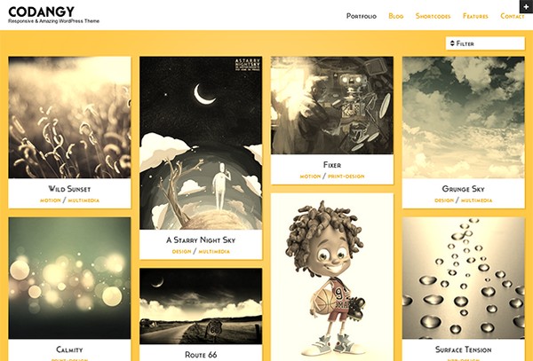 Codangy is compatible with WordPress 3.5, and is complimented with a ton of features including 500+ Google Fonts, custom font chooser, custom color selector, 50+ built in shortcodes, Twitter and Flickr widgets, demo content XML included, myriad page templates, integrated Google Maps and much more.