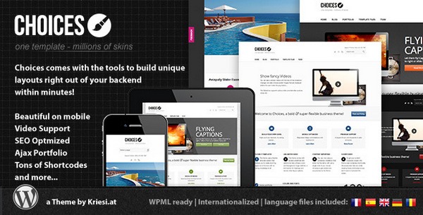 Choices is a the perfect WordPress responsive theme for business websites or blogs and comes feature packed to include responsive layout, translation ready, 14 predefined skins, custom widgets, extensive user manual, color picker options and a template builder.