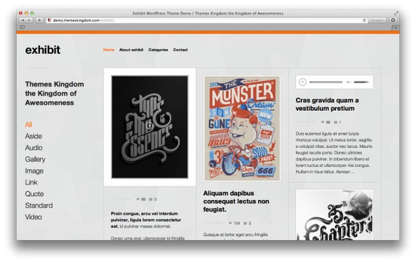 The Exhibit WordPress responsive theme is created with strict design elements, and is able to display links, quotes, galleries, audio, video and standard posts in an intuitive way. Its features include fully responsive design, custom theme administration, Google Maps integration, translation options, page templates, post formats and color changer.