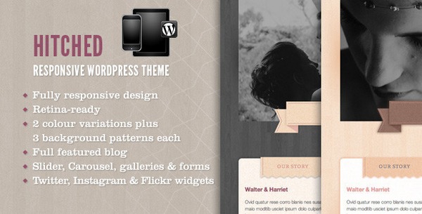 Hitched is elegant and responsive WordPress theme that is ready to work its magic right out of the box. With its retina ready graphic capabilities, and the ability to be rendered on virtually any device, screen size and resolution, hitched WordPress theme is definitely worth exploring. Some of its other features include a Twitter widget, 3 gallery layouts, RSVP and contact forms with validation, free support, guestbook page template, Flickr widget and shortcode and a responsive slider on the homepage.