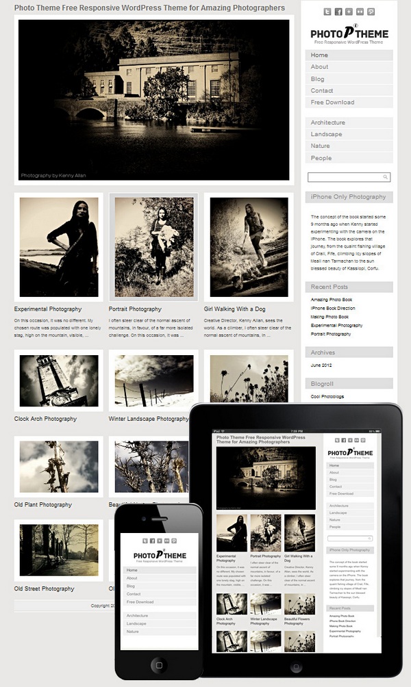 Photo Theme is a free WordPress theme that is great for designers, photographers and creatives. It boasts a long list of features including support and updates, Safari compatible, responsive design and WordPress 3.4+ Compatible.