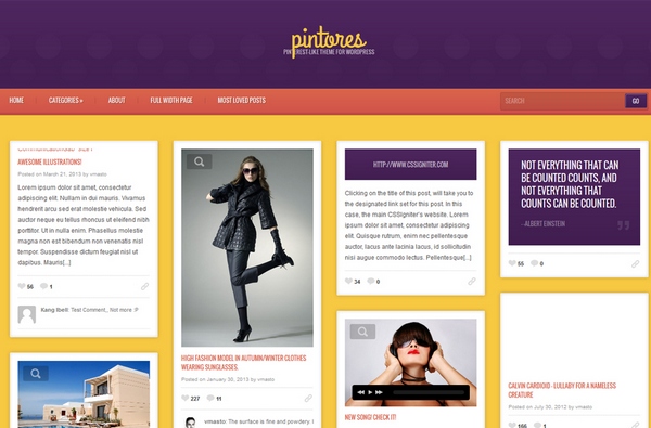 If you’re keen on using Pininterest as social media tool for your WordPress blog or website, You just may want to give the Pintores fully responsive WordPress theme a shot. This theme comes bundled with a host of features including favorites, post formats, powerful options, theme options, cross browser compatibility, shortcodes, custom menus, color variations and unrivalled support.