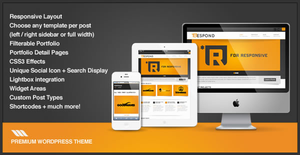 Respond is a premium WordPress theme that comes with an adaptive design and a whole lot of features including filterable portfolio, CSS3 effects, portfolio detail pages, lightbox integration, custom post types, widget areas, shortcodes and much more.