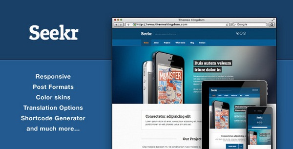 Seekr is a fully responsive WordPress theme that helps you showcase your work with no distractions. Its robust full width featured homepage slider is probably its best trait, but it has more to brag about including Google maps integration, SendLoop integration, MailChimp integration, translation options, post formats, color skins, fully responsive design and white labeled theme administration.