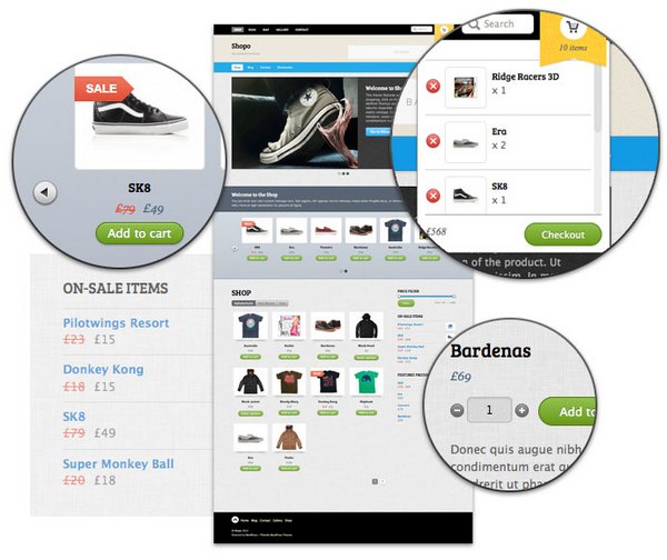 Shopo is a rather elegant Ecommerce theme for WordPress that is best suited for large scale retailers or those who have an abundance of products in their inventory. Some of its key features include header widget for display banner ad, Custom layout for WooCommerce shop, Optional RSS and search form, Animated back to top button, 7 theme skins, Custom welcome message, Coded with HTML5 & CSS3 and child theme support.