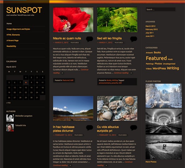 Sunspot is a shard WordPress theme that comes fully loaded with features such as custom header and background, two widget areas, responsive layout and much more.