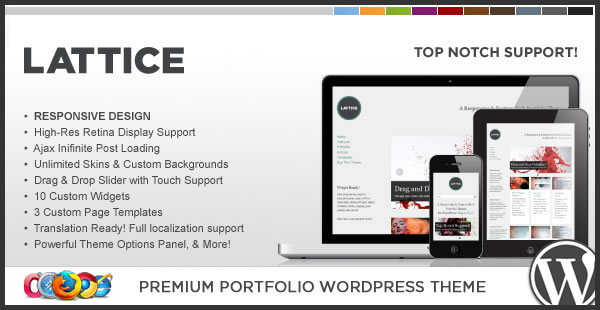 WP Lattice is a fully responsive theme for WordPress that is complimented with a load of features including high resolution retina display support, 10 custom widgets, unlimited skins and backgrounds, cross browser friendly, translation ready and a robust theme options panel.